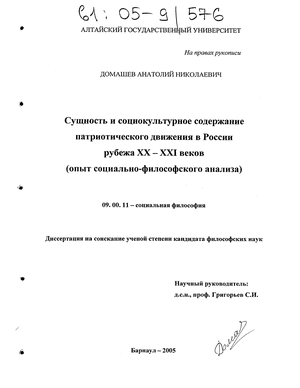 Цель исследования - изучение патриотического движения в России на рубеже XX-XXI веков в диалектике его социокультурной сущности и культурно-исторических проявлений.