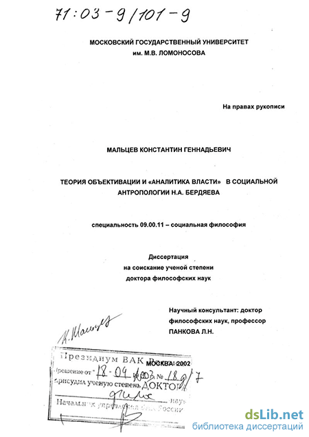 Мальцев Константин Геннадьевич. Теория объективации и "аналитика власти" в социальной антропологии Н.А. Бердяева : диссертация ... доктора философских наук : 09.00.11.- Москва, 2002.- 384 с.: ил. РГБ ОД, 71 03-9/101-9