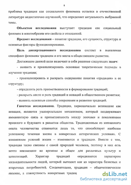 Предмет исследования – понятие традиции, его сущность, структура и основные факторы функционирования.