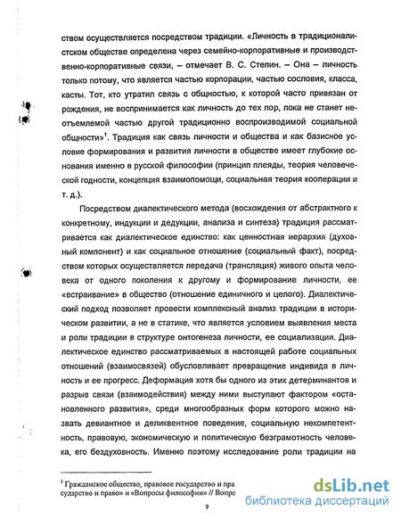 конкретному, индукции и дедукции, анализа и синтеза) традиция рассматривается как диалектическое единство: как ценностная иерархия (духовный компонент) и как социальное отношение (социальный факт), посредством которых осуществляется передача (трансляция) живого опыта человека от одного поколения к другому и формирование личности, ее «встраивание» в общество (отношение единичного и целого). Диалектический подход позволяет провести комплексный анализ традиции в историческом развитии, а не в статике, что является условием выявления места и роли традиции в структуре онтогенеза личности, ее социализации. Диалектическое единство рассматриваемых в настоящей работе социальных отношений (взаимосвязей) обусловливает превращение индивида в личность и ее прогресс. Деформация хотя бы одного из этих детерминантов и разрыв связи (взаимодействия) между ними выступают фактором «остановленного развития», среди многообразных форм которого можно назвать девиантное и деликвентное поведение, социальную некомпетентность, правовую, экономическую и политическую безграмотность человека, его бездуховность. Именно поэтому исследование роли традиции на