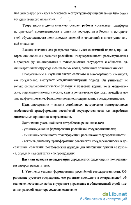 Цель диссертации - анализ устойчивых, исторически повторяющихся особенностей трансформации российской государственности для выработки оптимальных принципов ее организации.