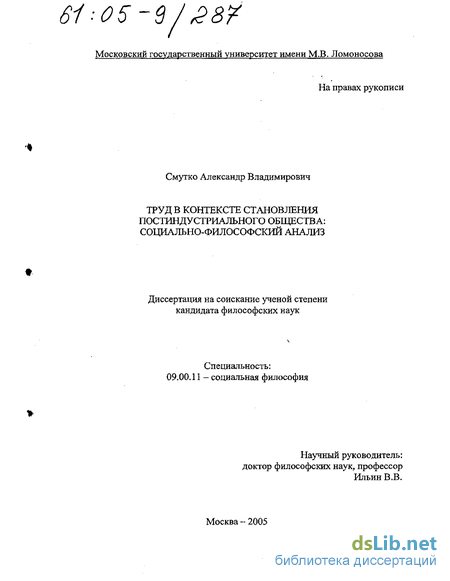 Автор опирался на теоретический анализ труда в обществах индустриального и постиндустриального - информационного типа. Труд в индустриальном обществе рассматривается в классической экономической теории У.Петти, А.Смитом, марксизмом. Теория постиндустриального общества сложилась на основании экономических, социальных, политологических концепций усилиями целой плеяды ученых. В науный оборот вводятся идеи: модель постиндустриального общества - Д.Белл;