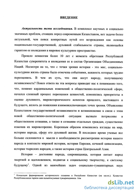 Актуальность темы исследования. В комплексе научных и социально значимых проблем, стоящих перед современным Казахстаном, нет задачи более актуальной, чем поиск конкретных путей его возрождения как основы национально-государственной, духовной стабильности страны, являющейся гарантом ее вхождения в мировое культурное пространство.