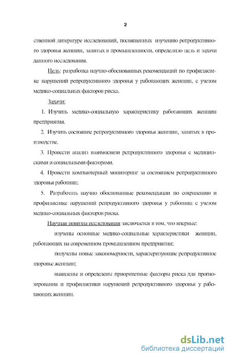 Научная новизна исследования заістючается втом, что впервые: изучены основные медико-социатьные характеристики женщин, работающих на современном промышленном предприятии;