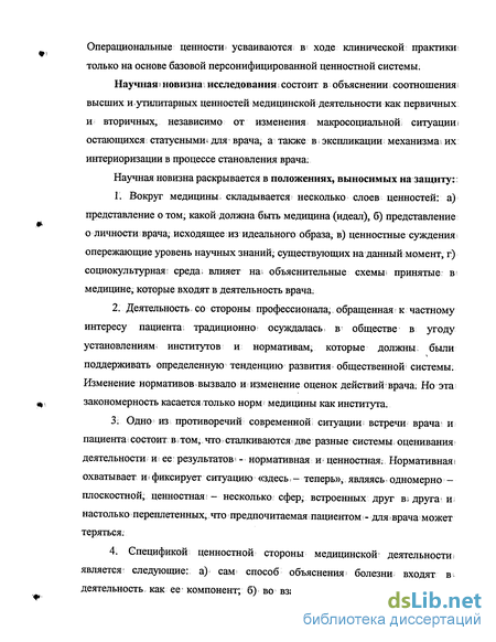 Научная? новизна і исследования! состоит в объяснении соотношения? высших и утилитарных ценностей медицинской деятельности как первичных и вторичных, независимо от изменения макросоциальной ситуации < остающихся статусными* для врача, а также в ; экспликации механизма; их интериоризации в процессе становления врача: