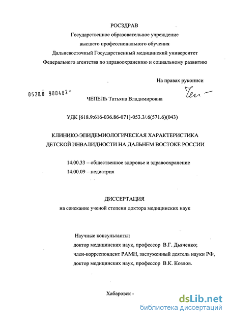 Диссертация проиллюстрирована 25 таблицами, 55 рисунками, 2 картограммами, 5 клиническими случаями. Список используемой литературы содержит 375 источников, в том числе 93 иностранных авторов. В приложении даны образцы используемых для обработки материалов карт, рекомендуемый перечень мероприятий в проект программы «Дети-инвалиды Хабаровского края» на 2009-2011 годы.