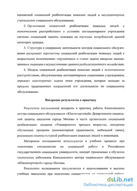 Структура и содержание деятельности центров социального обслуживания раскрывает перспективу социальной реабилитации пожилых людей с возрастными психическими нарушениями и ставит задачи введения инновационных подходов к осуществлению данного реабилитационного воздействия.