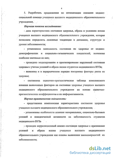 Следствием подобной ситуации можно считать фрагментарность научных изысканий, а также отсутствие единой комплексной программы исследований. Это, с одной стороны, не позволяет своевременно выявлять общие (для всей учащейся молодежи) и специфические (например, для студентов медицинского ВУЗа) факторы риска, а также особенности социально-гигиенических и медико-биологических характеристик, непосредственно влияющих на состояние здоровья студентов, с другой -дать научно обоснованную медико-социальную оценку состоянию здоровья и определить пути совершенствования организации медицинской помощи студентам конкретного высшего учебного заведения.