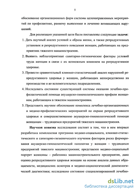 Следует признать необходимым внедрение системы целенаправленных мероприятий по профилактике, раннему выявлению и лечению патологии репродуктивной системы с учетом особенностей влияния производственной среды предприятий тяжелого машиностроения на репродуктивное здоровье женщин. Личный вклад автора в проведенное исследование. Автором само-оятельно проведен аналитический обзор отечественной и зарубежной ли-ратуры по изучаемой проблеме, составлена программа исследования, раз-ботаны статистические учетные формы, проведен сбор медико-социаль-