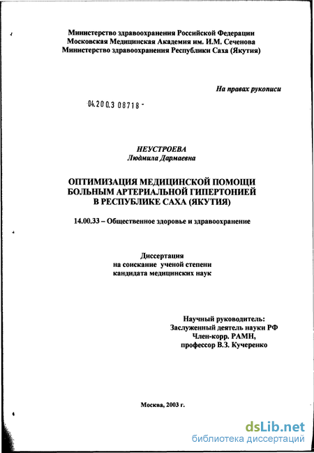 Республиканской программой «Профилактика и лечение артериальной гипертонии в Республике Саха (Якутия) на 2001 - 2007 г.г.» предусмотрена необходимость научных исследований проблем повышения качества и оптимизации путей организации лечебно-профилактической помощи при артериальной гипертонии (АГ). До последнего времени исследований по обозначенным проблемам в Республике Саха (Якутия) не проводилось, что явилось основанием для выполнения настоящей диссертационной работы.