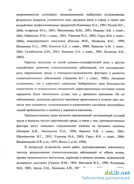 Переход населения из одной климато-географической зоны в другую способствует развитию стоматологических заболеваний, что подтверждает роль окружающей среды и социально-гигиенических факторов в развитии стоматологических заболеваний (Троценко К.Г. с соавт., 2005). Авторами установлено, что у коренного населения Хабаровского края большинство клинических и гигиенических показателей, характеризующих состояние тканей пародонта, были значительно лучше, чем у пришлого населения. По их наблюдениям, адаптация пришлого населения происходила в течение трех лет, после чего показатели гигиенического и клинического состояния околозубных тканей приближались к таковым у коренного населения.