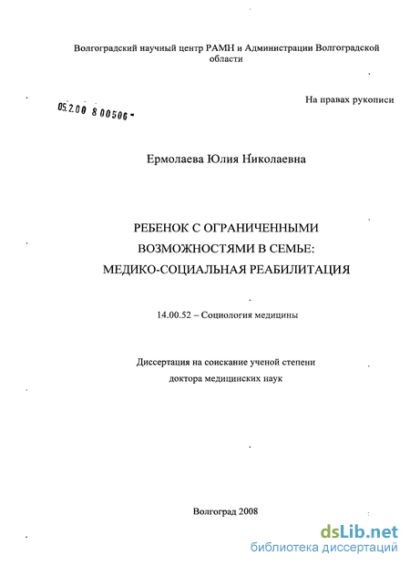 Цель диссертационного исследования научно обосновать и разработать концепцию медико-социальной реабилитации ребенка с ограниченными возможностями в семье на основе комплексного социологического исследования основных проблем детской инвалидности.