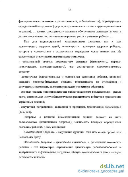 Определение «Здоровья» у детей, по мнению И.М. Воронцова (1999), отличается от определения «здоровья» взрослых, так как включает характеристику самого главного для детей процесса роста и развития. Именно этот процесс определяет основу детского здоровья и, как следствие, здоровья взрослого Б будущем. С другой стороны, здоровье ребенка надо рассматривать и как состояние жизнедеятельности, соответствующее биологическому возрасту, единство физических и наследственных характеристик, обусловленных генетическими и внешнесредовыми факторами [84]. Наиболее точно эти характеристики "Здоровья", объединены в определении Р.В. Тонковой-Янпольской [137] ... здоровье — это совокупность факторов (генетических, эмбриологических, постнатальиых, социальных), сочетание показателей (физическое и нервно-психическое развитие, функциональное состояние и резистентность, заболеваемость), формирующих определенный его уровень (здоров, пограничное состояние - группа риска - или нездоров), ... данная совокупность факторов обеспечивает жизнедеятельность детского организма соответственно периодов роста и развития ребенка... Как для индивидуальной характеристики здоровья, так и для коллективного здоровья детей, используются критерии здоровья ребенка, которые в соответствии с возрастными периодами могут изменяться. На современном этапе такими параметрами считаются: - оптимальный уровень достигнутого развитая (физического, нервно психического, интеллектуального), его соответствие хронологическому возрасту - достаточная функциональная и социальная адаптация ребенка, широкий диапазон приспособительных реакций, толерантность по отношению к допустимым нагрузкам, адекватное поведение в семье и обществе; - высокая степень сопротивляемости неблагоприятным воздействиям, прежде всего, оптимальная иммунобиологическая реактивность и быстрое преодоление стрессовых реакций; - отсутствие пограничных состояний и признаков хронических заболеваний [131, 132]. Здоровье с позиций биомедицинской модели состоит из пяти составляющих (компонентов здоровья), значимость которых определяется возрастом ребенка. К ним относятся: Соматическое здоровье - нарушение функции того или иного органа или нескольких сразу. Физическое здоровье - физическая активность и физическая готовность ребенка - это параметры, отражающие физическую работоспособность и толерантность к физическим нагрузкам, общую выносливость и двигательную активность человека. її Психическое здоровье - полноценное развитие высших психических функций, психических процессов и механизмов, В основе психического здоровья лежит полноценное развитие и психическое равновесие на всех этапах онтогенеза. Психологическое здоровье — это развитие личности, индивидуума. Оно предполагает интерес человека к жизни, свободу мысли, инициативу, увлеченность своим делом, активность, самостоятельность, ответственность, способность к риску, веру в себя, уважение других. Репродуктивное здоровье - это состояние полного физического, умственного и социального благополучия, а пе просто отсутствие болезней, недугов, относящихся к репродуктивной системе, ее функциям и процессам. В настоящее время при существующих крайне неблагоприятных показателях использовать термин "репродуктивное здоровье" не всегда корректно, более прав