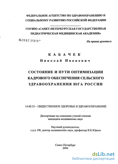 Актуальность исследования. Вопросы улучшения качества лечебно-профилактической помощи сельскому населению весьма актуальны, поскольку медико-социальные проблемы, характерные для нашего общества, особенно ярко проявляются в сельской местности. Резкое сокращение бюджетного финансирования отрасли, упадок сельского хозяйства крайне негативно сказались на состоянии сельского здравоохранения (Рогожников В.А. с соавт.,2004). В сложившихся условиях среди неотложных мер по выводу сельского здравоохранения из кризиса одно из ведущих мест принадлелшт решению проблемы кадрового обеспечения и рационального использования имеющихся кадровых ресурсов. Кадры являются решающим фактором реализации Национальных проектов в области здравоохранения.