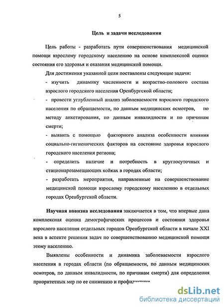 Научная новизна исследования заключается в том, что впервые дана комплексная оценка демографических процессов и состояния здоровья взрослого населения отдельных городов Оренбургской области в начале XXI века в аспекте решения задач по совершенствованию медицинской помощи этому населению.