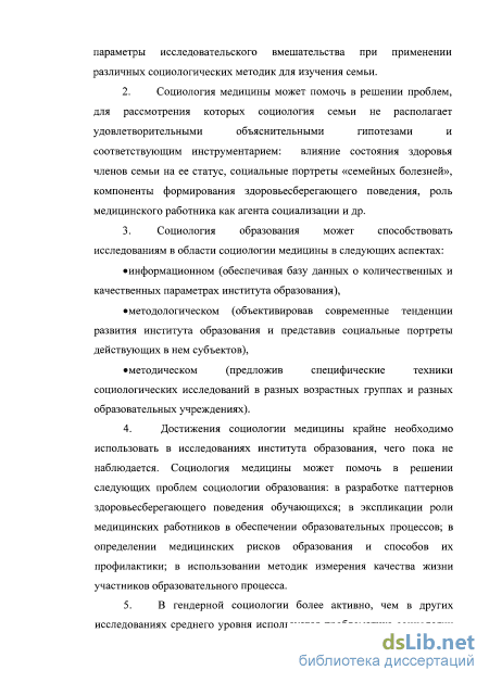 Социология семьи может способствовать эффективности исследований в социологии медицины в следующих направлениях: предоставляя критерии классификации семей, интерпретацию статистических материалов по функционированию института семьи, сведения о распределении социальных ролей в семье и о ее взаимодействии с другими социальными институтами, определяя параметры исследовательского вмешательства при применении различных социологических методик для изучения семьи.