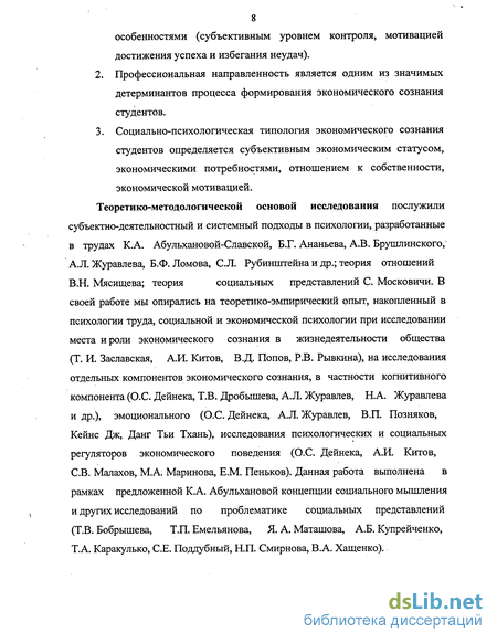 Теоретико-методологической основой исследования послужили субъектно-деятельностный и системный подходы в психологии, разработанные в трудах К.А. Абульхановой-Славской, Б.Г. Ананьева, А.В. Брушлинского, А.Л. Журавлева, Б.Ф. Ломова, С.Л. Рубинштейна и др.; теория отношений В.Н. Мясищева; теория социальных представлений С. Московичи. В своей работе мы опирались на теоретико-эмпирический опыт, накопленный в психологии труда, социальной и экономической психологии при исследовании места и роли экономического сознания в жизнедеятельности общества (Т. И. Заславская, А.И. Китов, В.Д. Попов, Р.В. Рывкина), на исследования отдельных компонентов экономического сознания, в частности когнитивного компонента (О.С. Дейнека, Т.В. Дробышева, А.Л. Журавлев, Н.А. Журавлева и др.), эмоционального (О.С. Дейнека, А.Л. Журавлев, В.П. Позняков, Кейнс Дж, Данг Тьи Тхань), исследования психологических и социальных регуляторов экономического поведения (О.С. Дейнека, А.И. Китов, СВ. Малахов, М.А. Маринова, Е.М. Пеньков). Данная работа выполнена в рамках предложенной К.А. Абульхановой концепции социального мышления и других исследований по проблематике социальных представлений (Т.В. Бобрышева, Т.П. Емельянова, Я. А. Маташова, А.Б. Купрейченко, Т.А. Каракулько, СЕ. Поддубный, Н.П. Смирнова, В.А. Хащенко).