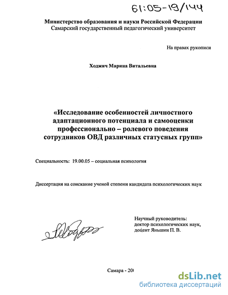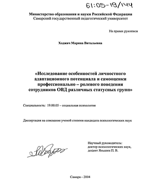 Цель диссертационного исследования: выявить особенности самооценки профессионально-ролевого поведения и личностный адаптационный потенциал сотрудников ОВД в зависимости от занимаемого ими профессионально-должностного статуса.