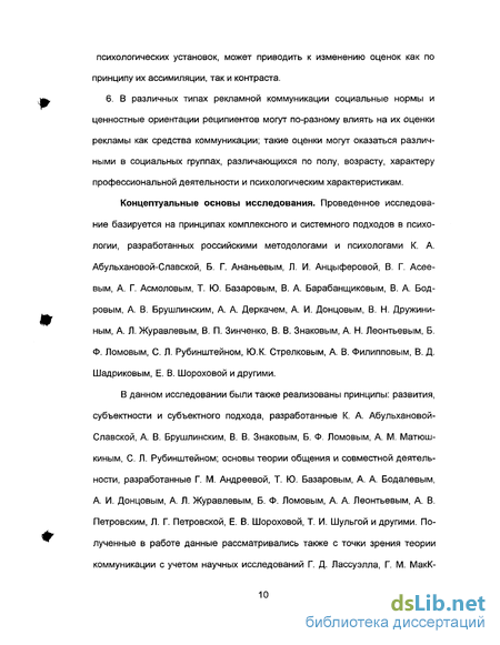 В данном исследовании были также реализованы принципы: развития, субъектности и субъектного подхода, разработанные К. А. Абульхановой-Славской, А. В. Брушлинским, В. В. Знаковым, Б. Ф. Ломовым, А. М. Матюш-киным, С. Л. Рубинштейном; основы теории общения и совместной деятельности, разработанные Г. М. Андреевой, Т. Ю. Базаровым, А. А. Бодалевым, А. И. Донцовым, А. Л. Журавлевым, Б. Ф. Ломовым, А. А. Леонтьевым, А. В. Петровским, Л. Г. Петровской, Е. В. Шороховой, Т. И. Шульгой и другими. Полученные в работе данные рассматривались также с точки зрения теории коммуникации с учетом научных исследований Г. Д. Лассуэлла, Г. М. МакК- люэна, А. Моля, Т. Ю. Базарова, А. А. Деркача, А. И. Донцова, В. Г. Зазыки-на, Л. М. Матвеевой, В. П. Морозова, Н. Д. Павловой, Е. Е. Прониной, Ю. А. Шерковина, П. Н. Шихирева и других; концепции маркетинга и маркетинговых коммуникаций Д. Аакера, Г. Армстронга, В. Вонг, Ф. Котлера, Т. Левитта, Э. Раиса, С. Ривкина, Д. Сондерс, Дж. Траута, В. А. Евстафьева, И. В. Крылова, И. Я. Рожкова и других; экономической психологии, политической психологии, психологии труда и психологии управления, представленные в работах Е. Бем-Баверка, А. Смита, Г. Тарда, Дж. Катоны, П. Друкера, Т. Левитта, Т. Ю. Базарова, Ю. Я. Голикова, О. С. Дейнека, Л. Г. Дикой, А. И. Китова, А. Н. Костина, Л. Г. Лаптева, В. В. Новикова, В. П. Познякова, Е. Н. Резникова, Ю. К. Стрелкова, А. В. Филиппова, А. С. Чернышева и других; теории нормативно-ценностной регуляции, представленной в работах С. Аха, Д. Т. Кэмпбелла, С. Милграмма, С. Московичи, М. Шерифа, М. И. Бобневой, А. Л. Журавлева, Н. А. Журавлевой, Н. М. Лебедевой, Д. А. Леонтьева, Е. Н. Резникова, Е.В. Шо-роховой, а также принципа совместности и психо-социального подхода А. Л. Журавлева и принципа единства теории и практики С. Л. Рубинштейна.