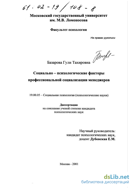 В соответствии с целью и задачами диссертационной работы предметом исследования выступают социально - психологические факторы профессиональной социализации менеджеров, рассматриваемой как процесс и результат овладения широким спектром социальных и профессиональных ролей, включающий осознание человеком себя как субъекта