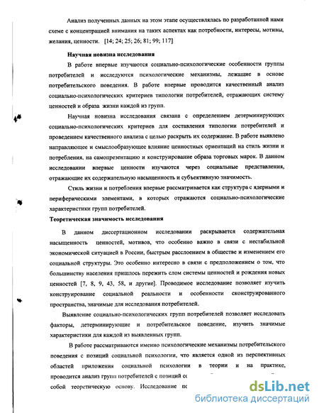 В работе впервые исследуются группы потребителей и выявляется их социально-психологическая специфика: образ жизни, ценностные ориентации, нормы, интересы, потребности. Поскольку в выборе товара большое значение имеет субъективная ценность характеристик товаров, то исследование социальных представлений, детерминирующих потребительское поведение, позволяет выявить основания для составления типологии потребителей, исследовать процесс восприятия такого социального объекта как торговая марка [8; 82] и выявить специфику восприятия объектов потребления.