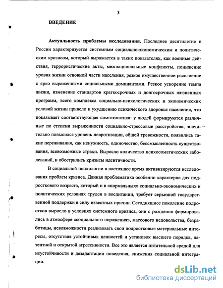 В социальной психологии в настоящее время активизируются исследования проблем кризиса. Данная проблематика особенно характерна для подросткового возраста, который и в «нормальных» социально-экономических и политических условиях труден в воспитании, требует серьезной государственной поддержки в силу известных причин. Сегодняшнее поколение подростков выросло в условиях системного кризиса, они с рождения формировались в атмосфере «социального поражения», массового недовольства, безработицы, невозможности реализовать свои подростковые материальные интересы, отсутствия устойчивых ценностей и установок высшего порядка, латентной и открытой агрессивности. Все это является питательной средой для неустойчивости и дезадаптации поведения, снижения социальной интеграции.