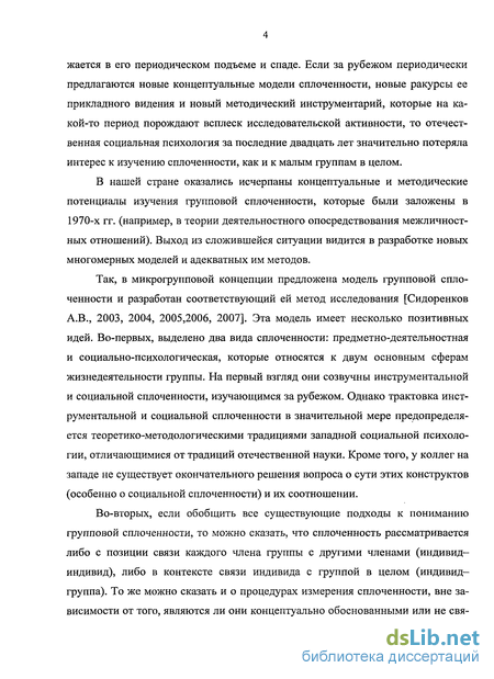 жается в его периодическом подъеме и спаде. Если за рубежом периодически предлагаются новые концептуальные модели сплоченности, новые ракурсы ее прикладного видения и новый методический инструментарий, которые на какой-то период порождают всплеск исследовательской активности, то отечественная социальная психология за последние двадцать лет значительно потеряла интерес к изучению сплоченности, как и к малым группам в целом.