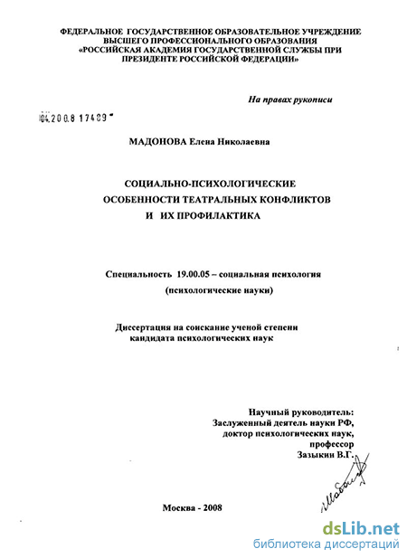 Актуальность темы исследования обусловлена тем, что при всем разнообразии психологических и конфликтологических исследований организационных конфликтов обращает на себя внимание повышенный интерес только к определенным типам организаций, в которых происходят конфликты: преимущественно производственные, воинские коллективы, учебные заведения и др. При этом в них главным образом исследовались межличностные конфликты (Акимова Е.Е., Анцупов А.Я, Гришина Н.В., Гусева А.С., Грызунова Г.В., Зазыкин В.Г., Зайцева Е.В., Козлов В.В., Реутов М.И., Леонов Н.И. и др.). Заметим, что и в других науках, в частности социологии, значительное внимание уделено конфликтам, связанным с функционированием собственно организационных систем - социальным, трудовым конфликтам, социально-экономическим, инновационным, собственно организационным (Зайцев А.Г., Александрова Е.В, Антоненко Н.В, Гудакова Ж.И., Калашников Д.В., Радугин К.А., Король О.О., Лаптев А.В., Шило И.Н.). В связи с этим ощущается серьезный недостаток психологических исследований конфликтов, которые часто происходят в других типах организаций. Крайне мало психологических и иных исследований конфликтов в организациях, в которых труд отличается высоким уровнем интеллектуального содержания, например, в научных организациях. Практически отсутствуют психологические исследования конфликтов в творческих и художественно-творческих организациях, особенно таких, как театр, то есть театральных конфликтов. Знания о систематизированных психологических исследованиях театральных конфликтов отсутствуют, несмотря на огромную роль театра в духовной жизни общества. Вместе с тем, в деятельности театров заложено немало противоречий, которые приводят к конфликтам, имеющим негативное для творческого процесса и самой целостности театра последствиям. Можно привести немало тому примеров.