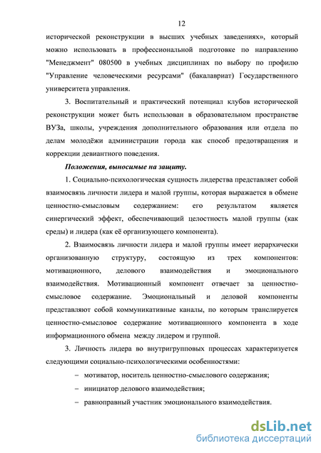 4. В условиях деятельности клубов исторической реконструкции, существующих в рамках молодежной субкультуры, лидер выступает в роли агента социализации. Социализация остальных участников группы обеспечивается в процессе ценностно-смыслового обмена между лидером и группой. Ценностно-смысловой обмен осуществляется по каналам делового и эмоционального взаимодействия при инициирующем воздействии мотивационной сферы личности лидера.