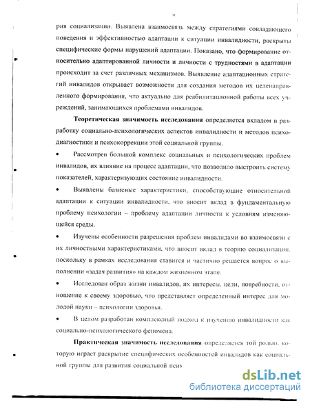 Сочетание высокой теоретической и практической значимости с недостаточной разработанностью многих аспектов социально-психологических проблем инвалидов обусловило актуальность диссертационного исследования и постановку его целей.