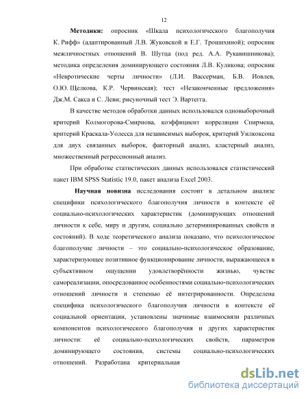 Обработка данных осуществлялась с помощью программного пакета IBM SPPS Statistic 19.0 - одновыборочный критерий Колмогорова-Смирнова, коэффициент корреляции Спирмена, критерий Краскала-Уолесса для независимых выборок, критерий Уилкоксона для двух связанных выборок, факторный анализ, кластерный анализ, множественный регрессионный анализ (метод пошагового отбора).