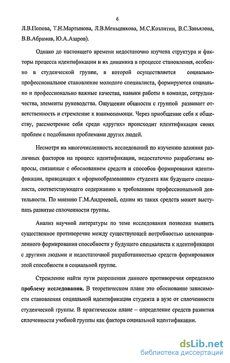 Стремление найти пути разрешения данного противоречия определило проблему исследования. В теоретическом плане это обоснование зависимости становления социальной идентификации студента в вузе от сплоченности студенческой группы. В практическом плане - определение средств развития сплоченности учебной группы как фактора социальной идентификации.