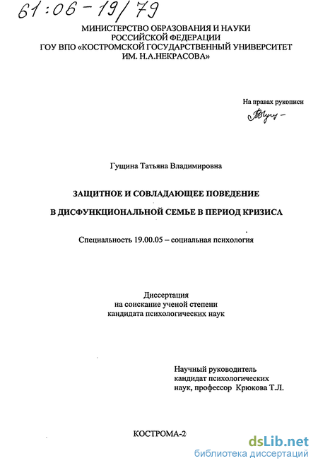 Проблема диссертационного исследования заключается в следующем: каковы особенности и соотношение защитного и совладающего поведения в дисфункциональной семье в период кризиса. Как проявляются и влияют механизмы психологической защиты и стратегии совладающего поведения девиантных матерей на способы адаптации их детей.