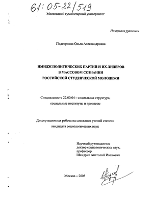 Предметом диссертационного исследования является образы политических партий и их лидеров, сложившиеся в массовом сознании российской студенческой молодежи.