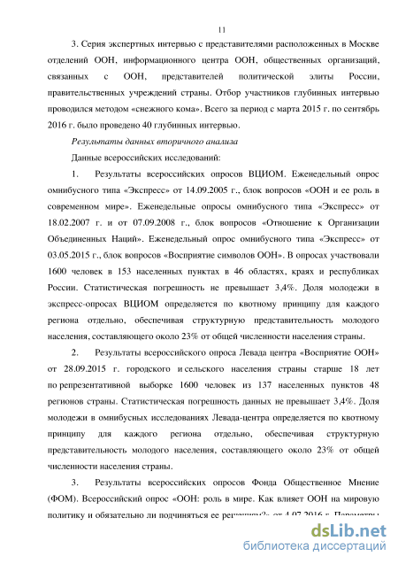 Результаты всероссийских опросов Фонда Общественное Мнение (ФОМ). Всероссийский опрос «ООН: роль в мире. Как влияет ООН на мировую политику и обязательно ли подчиняться ее решениям?» от 4.07.2016 г. Параметры опроса: репрезентативный опрос населения от 18 лет и старше. Доля молодежи в возрасте 18 - 30 лет составила 27%. В опросе участвовали 1500 респондентов - жителей 104 городских и сельских населенных пунктов в 53 субъектах РФ. Статистическая погрешность не превышает 3,6%. Всероссийский опрос «ООН: роль в мире. Россияне оценивают роль ООН и ее влияние на международную жизнь» от 30.09.2015 г. Параметры опроса: репрезентативный опрос населения от 18 лет и старше. Доля молодежи в возрасте 18 - 30 лет составила 27%. В опросе участвовали 1000 респондентов. Интервью в режиме телефонного опроса по случайной выборке номеров мобильных и стационарных телефонов. 320 городов, 160 сел. Статистическая погрешность не превышает 3,8%.
