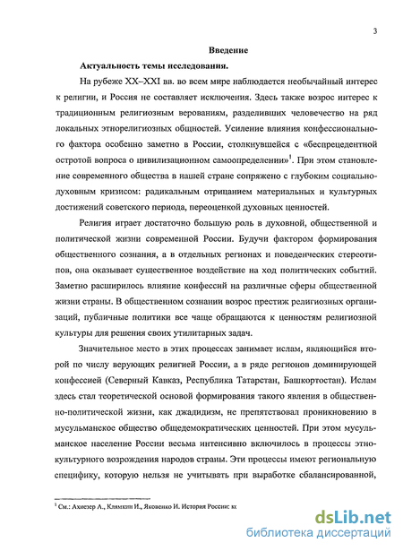 На рубеже ХХ-ХХІ вв. во всем мире наблюдается необычайный интерес к религии, и Россия не составляет исключения. Здесь также возрос интерес к традиционным религиозным верованиям, разделивших человечество на ряд локальных этнорелигиозных общностей. Усиление влияния конфессионального фактора особенно заметно в России, столкнувшейся с «беспрецедентной остротой вопроса о цивилизационном самоопределении»1. При этом становление современного общества в нашей стране сопряжено с глубоким социально-духовным кризисом: радикальным отрицанием материальных и культурных достижений советского периода, переоценкой духовных ценностей.