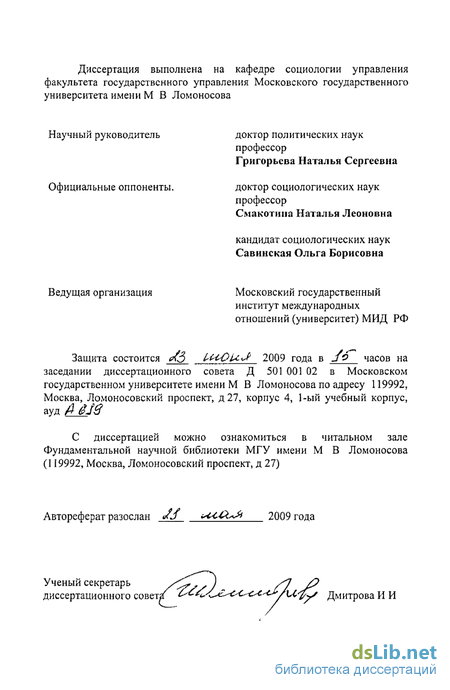 Диссертационная работа обсуждалась на кафедре социологии управления факультета государственного управления Московского государственного университета имени MB Ломоносова и была рекомендована к защите