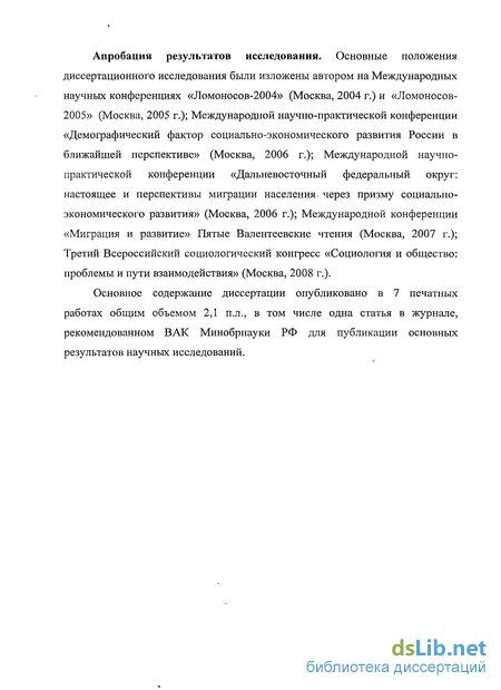 Апробация результатов исследования. Основные положения диссертационного исследования были изложены автором на Международных научных конференциях «Ломоносов-2004» (Москва, 2004 г.) и «Ломоносов-2005» (Москва, 2005 г.); Международной научно-практической конференции «Демографический фактор социально-экономического развития России в ближайшей перспективе» (Москва, 2006 г.); Международной научно-практической конференции «Дальневосточный федеральный округ: настоящее и перспективы миграции населения, через призму социально-экономического развития» (Москва, 2006 г.); Международной конференции «Миграция и развитие» Пятые Валентеевские чтения (Москва, 2007 г.); Третий Всероссийский социологический конгресс «Социология и общество: проблемы и пути взаимодействия» (Москва, 2008 г.).