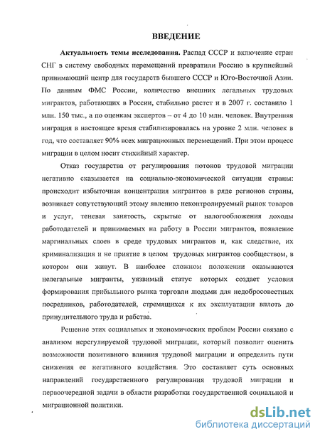 Актуальность темы исследования. Распад СССР и включение стран СНГ в систему свободных перемещений превратили Россию в крупнейший принимающий центр для государств бывшего СССР и Юго-Восточной Азии. По данным ФМС России, количество внешних легальных трудовых мигрантов, работающих в России, стабильно растет и в 2007 г. составило 1 млн. 150 тыс., а по оценкам экспертов - от 4 до 10 млн. человек. Внутренняя миграция в настоящее время стабилизировалась на уровне 2 млн. человек в год, что составляет 90% всех миграционных перемещений. При этом процесс миграции в целом носит стихийный характер.