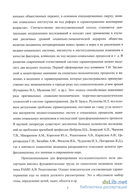 Степень научной разработанности темы исследования. В 90-е годы XX в. центральной темой медико-социологических исследований было изучение здравоохранения как социального института и путей его модернизации в ходе трансформации российского общества. Главная отличительная особенность этого периода состоит в том, что при сохранении прежней методологии акцент был сделан на изучении социальных взаимоотношений в здравоохранении и их роли в трансформационных процессах. В условиях радикальных общественных перемен, в основном инициированных сверху, влияние социальных институтов на ход реформ в здравоохранении неизмеримо возрастает. Соответственно институциональный подход становится центральным направлением исследований и находит свое применение в изучении различных уровней социально-экономической иерархии общества, включая механизмы интериоризации новых правил и норм и их реализации в медико-социальных системах, институты и институциональные изменения в качестве факторов, влияющих на ход медико-социальных процессов и т.д. В развитии современной отечественной системе здравоохранения можно выделить два ведущих подхода. Первый сформирован под влиянием Т.И. Заславской и акцентировал внимание на социально-экономических процессах и явлениях в медицине и здравоохранении, которые рассматривались преимущественно под экономическим и гораздо реже под социологическим углом зрения (Кучеренко В.З., Малахова Н.Г. и др.). Этот подход способствовал появлению ряда оригинальных социально-экономических теоретико-методологических технологий в системе здравоохранения. Дж.В. Браун, Русинова Н.Л. исследовали актуальные проблемы здравоохранения, поставив во главу угла целостное восприятие медико-социальных систем и социальных процессов, выявление социальных механизмов и последствий трансформационного процесса. В научной литературе существует достаточно большое количество исследований по проблемам врачебной профессии (Боброва И.Б., Боярский А.П., Чернова Т.В., Макаренков A.M., Коротков Ю.А., Решетников А.В., Кириллов А.В., Царегородцев Г.И., Билибин А.Ф., Филатов В.Б., Чудинова И.Э., Погорелов Я.Д.), где в контексте социологии медицины раскрываются отдельные аспекты профессионализма, его значение в современном мире.