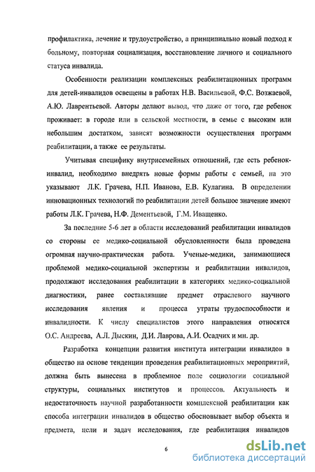 4. В теоретическом плане актуальность темы данного исследования связана со сложностью феномена инвалидности, недостаточной изученностью социальной природы реабилитации как одного из важнейших путей и способов социального решения проблемы инвалидности в целом.
