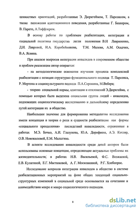 - теорию социальной нормы, адаптации и отклонений Э.Дюркгейма, с помощью которых была выделена социальная группа людей - инвалидов, подлежащих социологическому исследованию и дальнейшему определению путей интеграции их в общество.