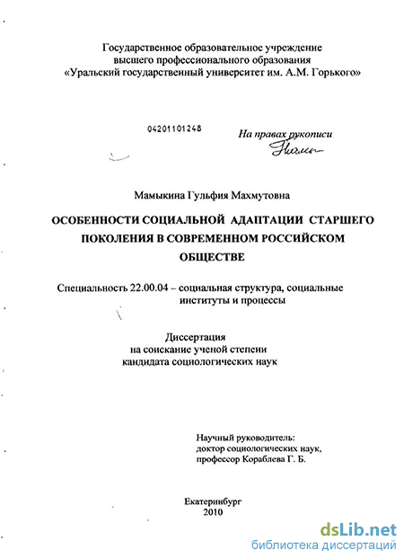 Цель диссертационной работы - анализ особенностей адаптации старшей поколенческой общности к новым условиям современного российского общества как необходимая предпосылка благополучной старости.