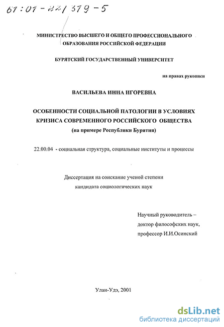Васильева Инна Игоревна. Особенности социальной патологии в условиях кризиса современного российского общества : На примере Республики Бурятия : диссертация ... кандидата социологических наук : 22.00.04.- Улан-Удэ, 2001.- 164 с.: ил. РГБ ОД, 61 01-22/319-5