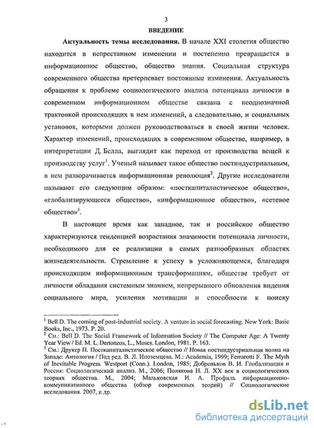 Актуальность темы исследования. В начале XXI столетия общество находится в непрестанном изменении и постепенно превращается в информационное общество, общество знания. Социальная структура современного общества претерпевает постоянные изменения. Актуальность обращения к проблеме социологического анализа потенциала личности в современном информационном обществе связана с неоднозначной трактовкой происходящих в нем изменений, а следовательно, и социальных установок, которыми должен руководствоваться в своей жизни человек. Характер изменений, происходящих в современном обществе, например в интерпретации Д. Белла, выглядит как переход от производства вещей к производству услуг1. Ученый называет такое общество постиндустриальным, в котором разворачивается информационная революция2. Другие исследователи дают ему следующие названия: «посткапиталистическое общество», «глобализирующееся общество», «информационное общество», «сетевое общество»''.