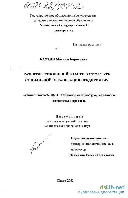 Апробация результатов исследования. Диссертация подготовлена на кафедре социологии Ульяновского государственного университета, и там же проводилось ее обсуждение. Результаты диссертационного исследования докладывались также на методологическом семинаре кафедры государственного и муниципального управления Пензенского государственного университета. Основные положения диссертации опубликованы в 6 научных статьях и изложены на четырех ежегодных научно-практических конференциях Ульяновского государственного университета (1999-2001 гг.) и пяти межвузовских научно-практических конференциях, проводимых Ульяновским государственным техническим университетом (1999-2003 гг.). Материалы диссертации использовались при чтении курса лекций «Социология управления» и составлении методических рекомендаций к курсу «Социология организации и управления».
