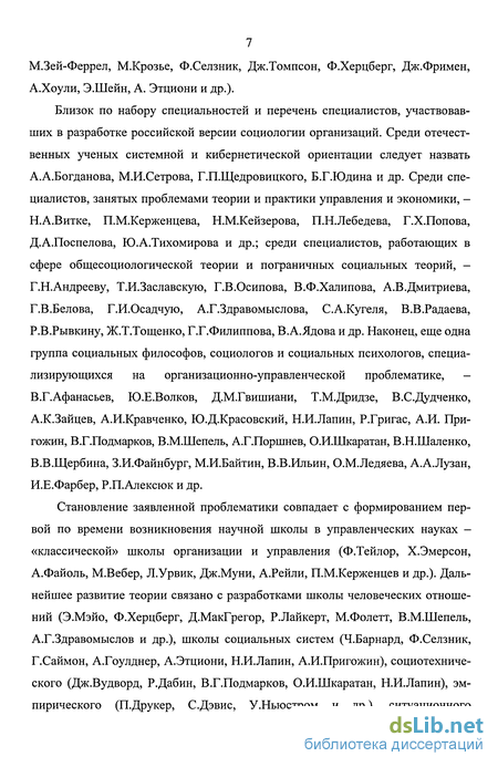 7 М.Зей-Феррел, М.Крозье, Ф.Селзник, Дж.Томпсон, Ф.Херцберг, Дж.Фримен, А.Хоули, Э.Шейн, А. Этциони и др.).