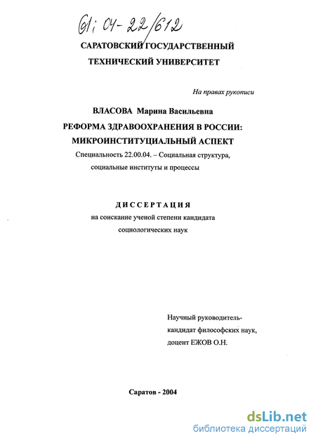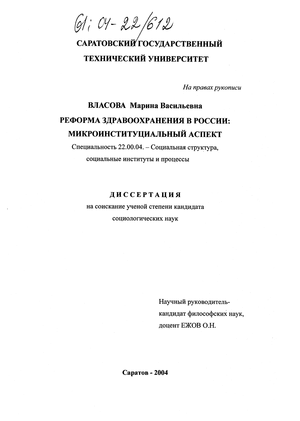 Актуальность темы исследования. Социологический анализ институциализации реформы здравоохранения в России является актуальной задачей, так как в новых экономических условиях требуется изменение не только организационного механизма, но и социальной составляющей института охраны здоровья. Если его правовые и финансово-организационные основы можно трансформировать волевым путем относительно быстро, то таким же образом невозможно изменить социальные установки, детерминирующие отношение населения к ценности здоровья и определяющие характер социального взаимодействия в процессе лечения.