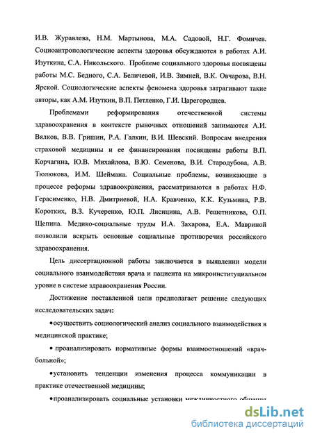 Цель диссертационной работы заключается в выявлении модели социального взаимодействия врача и пациента на микроинституциальном уровне в системе здравоохранения России.