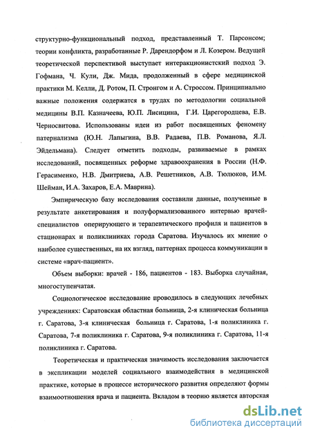 структурно-функциональный подход, представленный Т. Парсонсом; теории конфликта, разработанные Р. Дарендорфом и Л. Козером. Ведущей теоретической перспективой выступает интеракционистский подход Э. Гофмана, Ч. Кули, Дж. Мида, продолженный в сфере медицинской практики М. Келли, Д. Ротом, П. Стронгом и А. Строссом. Принципиально важные положения содержатся в трудах по методологии социальной медицины В.П. Казначеева, Ю.П. Лисицина, Г.И. Царегородцева, Е.В. Черносвитова. Использованы идеи из работ посвященных феномену патернализма (Ю.Н. Лапыгина, В.В. Радаева, П.В. Романова, Я.Л. Эйдельмана). Следует отметить подходы, развиваемые в рамках исследований, посвященных реформе здравоохранения в России (Н.Ф. Герасименко, Н.В. Дмитриева, А.В. Решетников, А.В. Тюлюков, И.М. Шейман, И.А. Захаров, Е.А. Маврина).